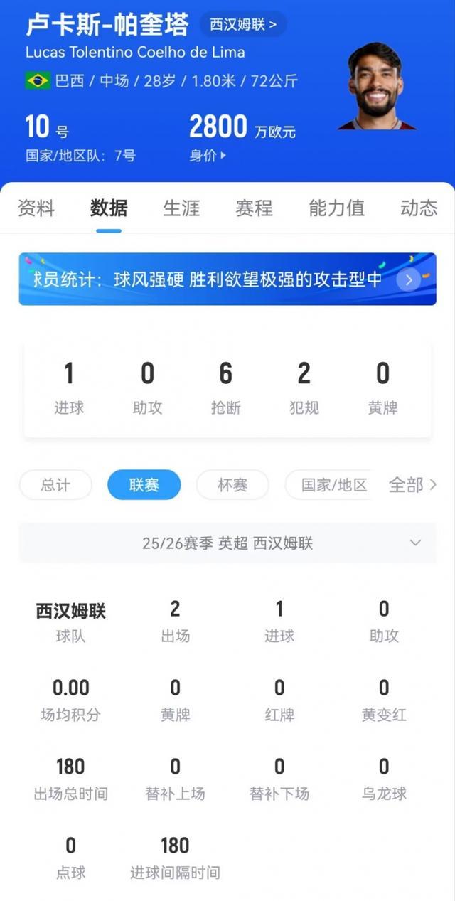 周中对阵狼队的联赛杯中帕奎塔也贡献1个进球,但这几场比赛中西汉姆联均未能获得最终的胜利。他目前的德转身价为2800万欧元。