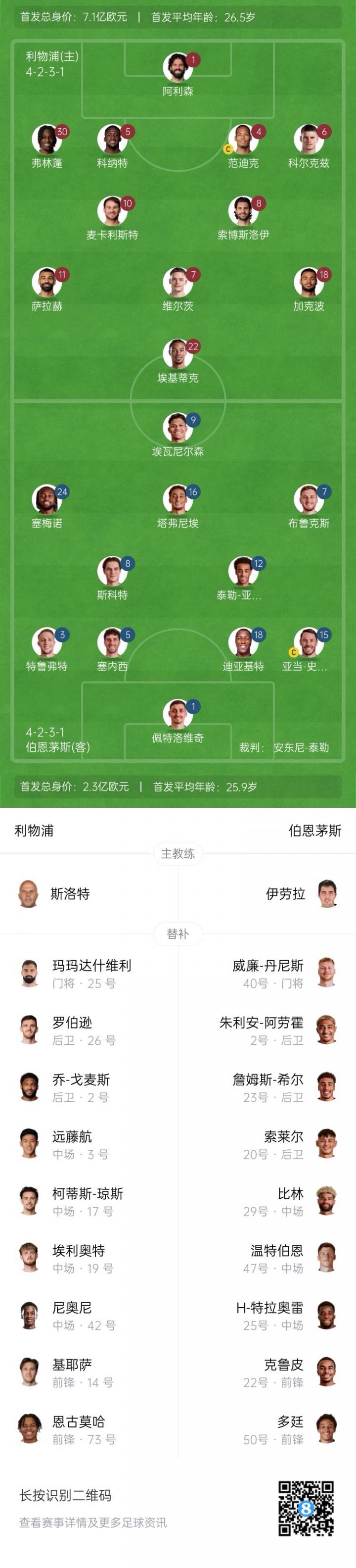 利物浦替补:25-玛玛达什维利、2-戈麦斯、3-远藤航、14-基耶萨、17-琼斯、19-埃利奥特、26-罗伯逊、42-尼奥尼、73-恩古莫哈