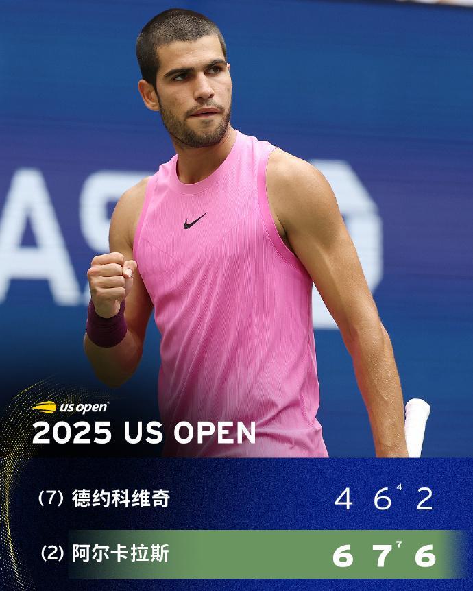 北京时间9月6日,2025年美网男单半决赛,前赛会冠军、2号种子阿尔卡拉斯对阵赛会4冠王、7号种子德约科维奇。阿尔卡拉斯以6-4、7-6(4)和6-2连赢三盘,总分3-0横扫德约科维奇,连续6轮均是总分3-0横扫,生涯第二次晋级美网男单决赛,也是连续3站大满贯赛事晋级男单决赛,以及生涯第七次晋级大满贯男单决赛,决赛将对阵辛纳和阿利亚西姆之间的胜者。德约科维奇在比赛中出现肩部不适,今年四大满贯全部止步四强,再度无缘冲击第25座大满贯冠军。