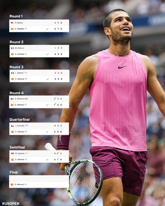 阿尔卡拉斯晋级美网男单决赛,确保至少获得250万美元与1300分,德约科维奇止步美网男单四强,获得126万美元与800分。